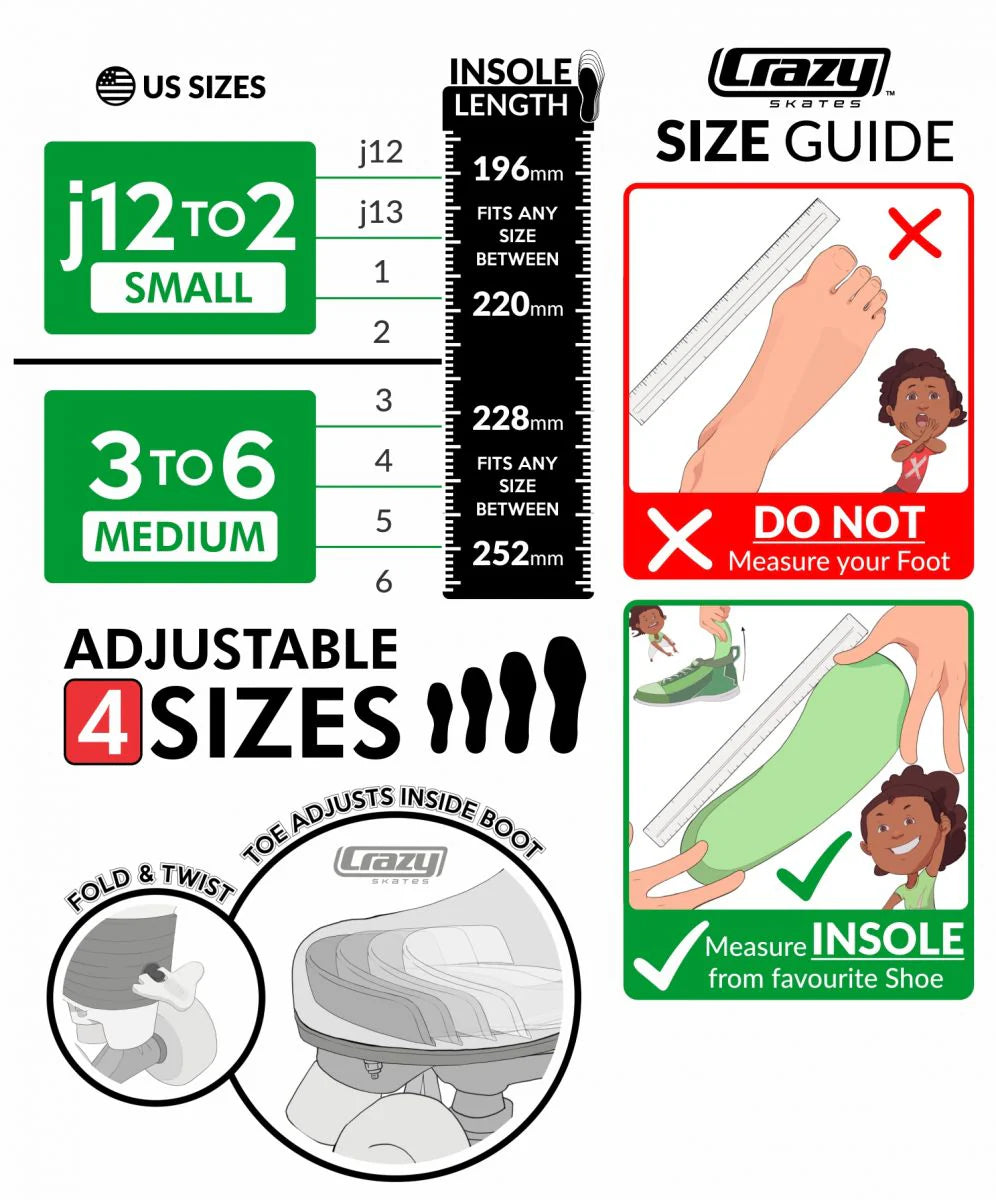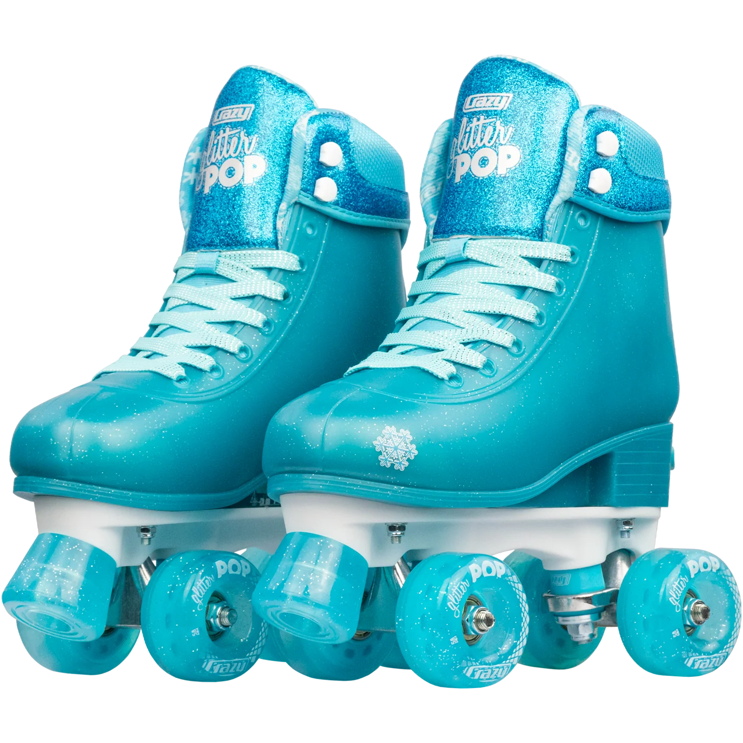 Crazy Glitter POP roller skate features glitter-infused soft plastic boots that adjust to fit growing feet through a patented internal size adjustment system, that gives you 4 sizes in one skate.